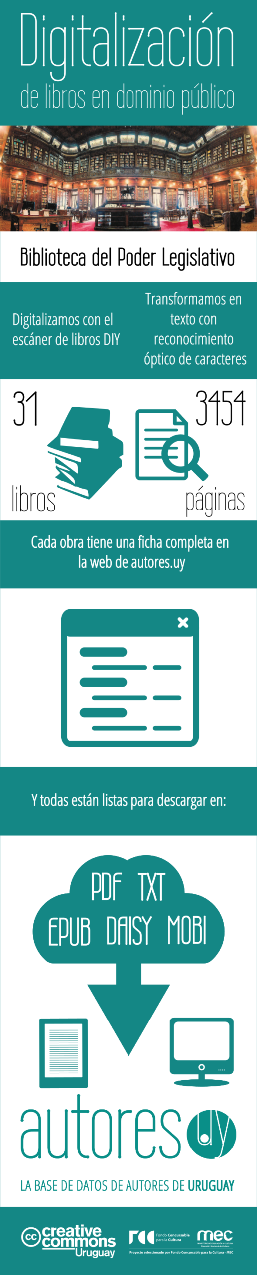 Les presentamos los primeros resultados del trabajo de digitalización que realizamos en la Biblioteca del Poder Legislativo (BPL). Ponemos a disposición de toda la ciudadanía 31 obras de alto valor patrimonial pertenecientes a la colección Camareta de la BPL. La puesta a disposición de las obras forma parte del proyecto ganador del Fondo Concursable para la Cultura con el cual digitalizaremos materiales bibliográficos de 6 bibliotecas de distintos departamentos del país. Asimismo, se enmarca en el convenio de cooperación firmado entre Creative Commons Uruguay y la BPL. En la primera infografía presentamos un resumen de los resultados.